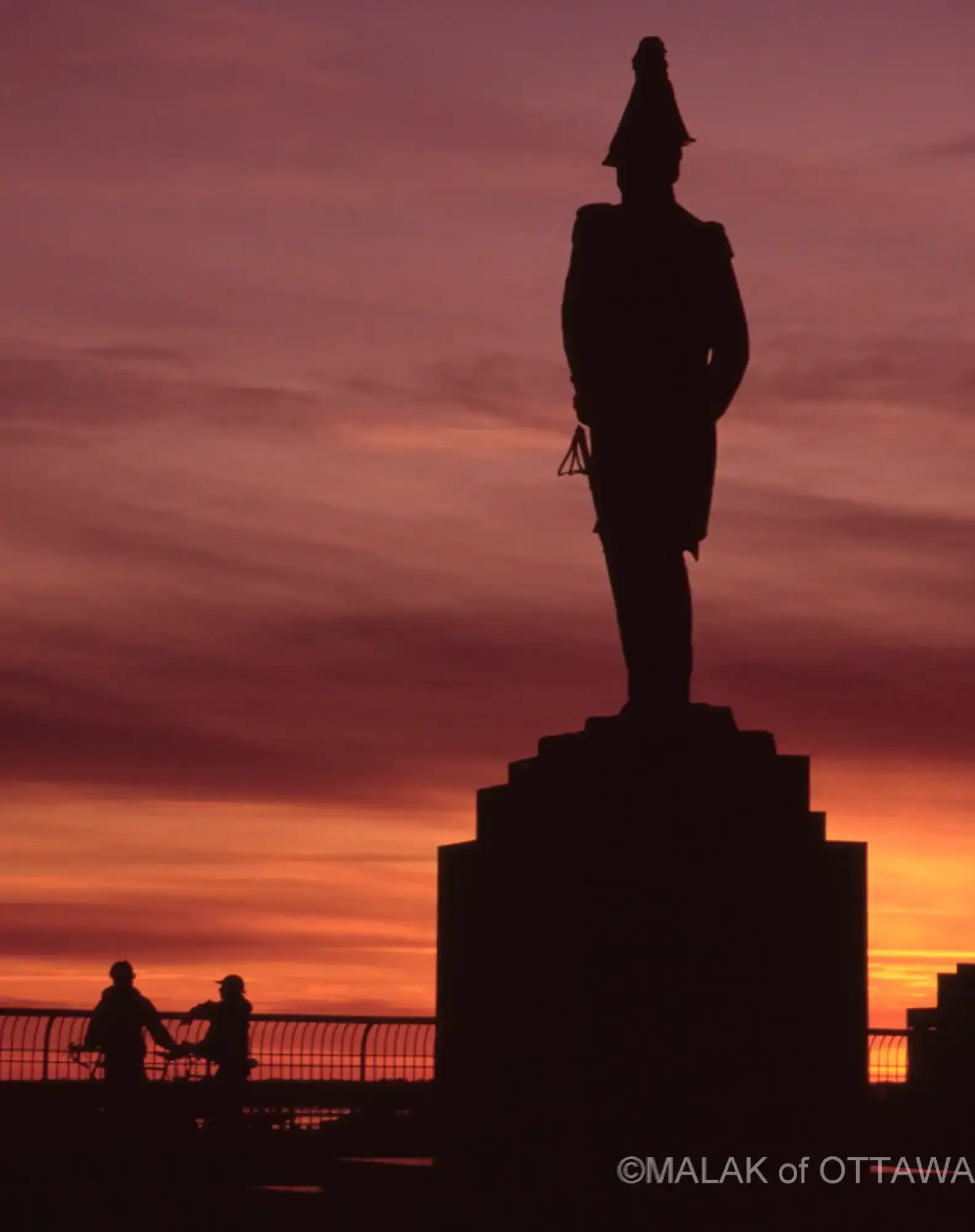 The statue of Lt.-Colonel John By, builder of the Rideau Canal and founder of Ottawa, stands high on the cliff rising from the Ottawa River and facing the Parliament Buildings, Ottawa, Ontario