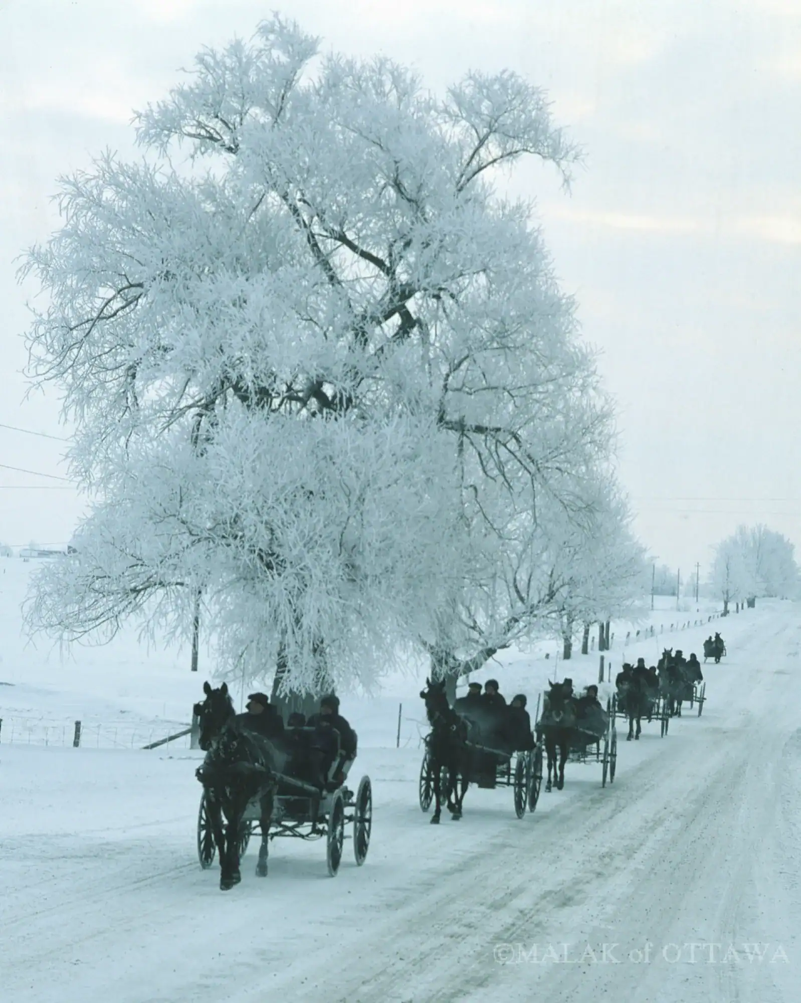 Farmers from the Mennonite community near Kitchener, Ontario, go to Meeting in their horse-drawn buggies. 1977