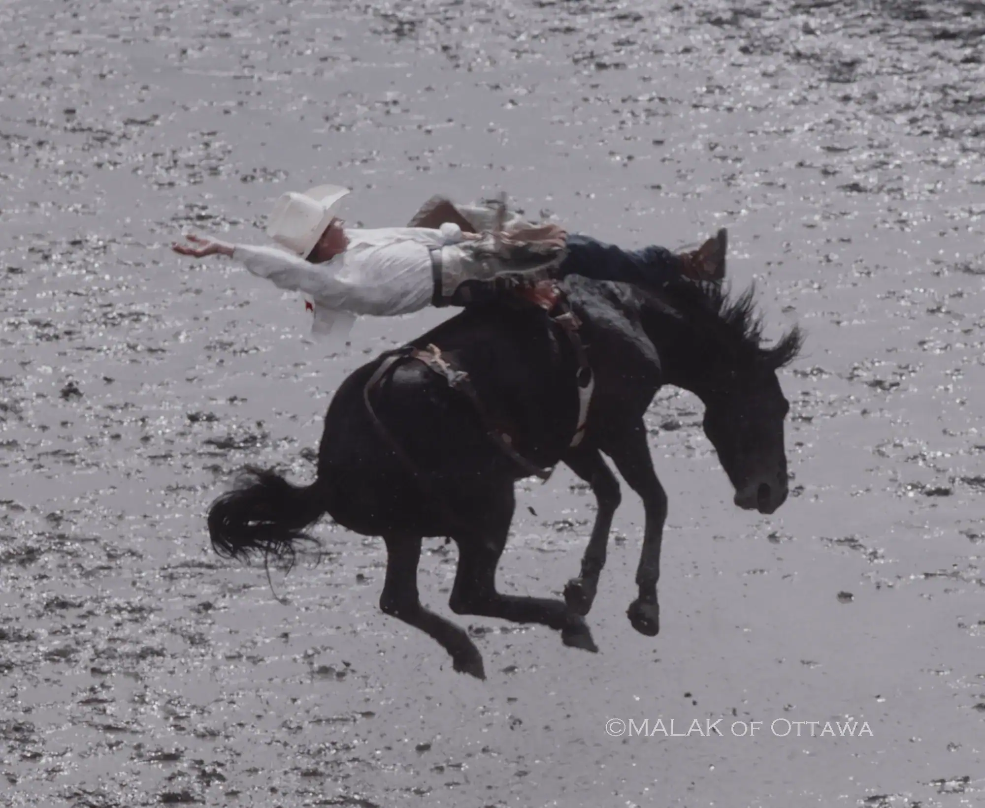 A cowboy bareback bronco-rider at the Calgary Stampede, Alberta, one of the premier rodeo shows in North America.